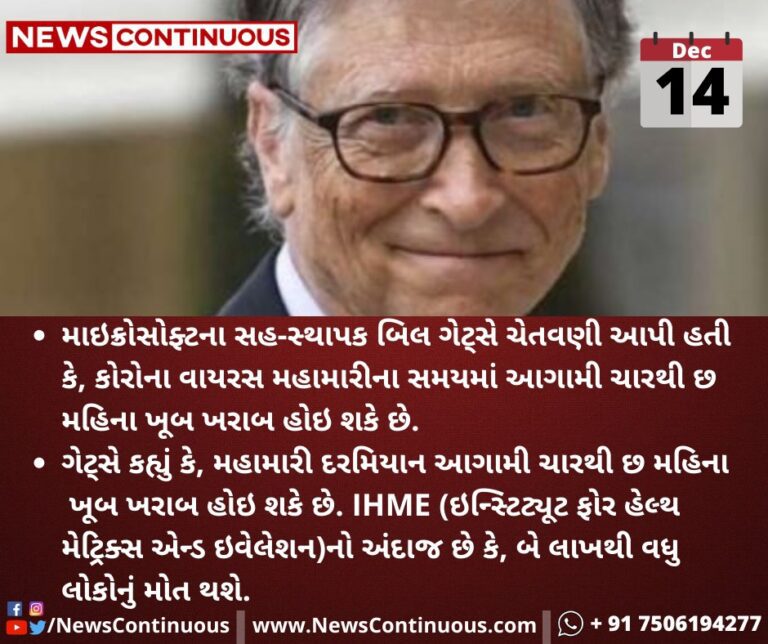 ગેટ્સે કહ્યું કે, મહામારી દરમિયાન આગામી ચારથી છ મહિના ખૂબ ખરાબ હોઇ શકે છે. IHME (ઇન્સ્ટિટ્યૂટ ફોર હેલ્થ મેટ્રિક્સ એન્ડ ઇવેલેશન)નો અંદાજ છે કે, બે લાખથી વધુ લોકોનું મોત થશે. જો આપણે માસ્ક પહેરવું, સોશિયલ ડિસ્ટેન્સિંગ જાળવવું જેવા નિયમોનું પાલન કરીએ તો આ સંભવિત મૃત્યુમાંથી મોટાભાગનાને રોકી શકાય છે.