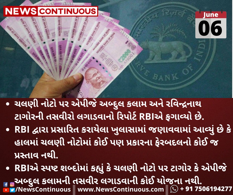 ચલણી નોટો પર એપીજે અબ્દુલ કલામ અને રવિન્દ્રનાથ ટાગોરની તસવીરો લગાડવાનો રિપોર્ટ RBIએ ફગાવ્યો છે.