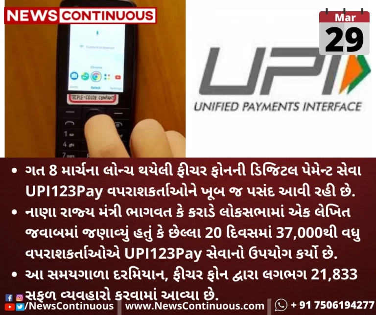 ગત 8 માર્ચના લોન્ચ થયેલી ફીચર ફોનની ડિજિટલ પેમેન્ટ સેવા UPI123Pay વપરાશકર્તાઓને ખૂબ જ પસંદ આવી રહી છે.