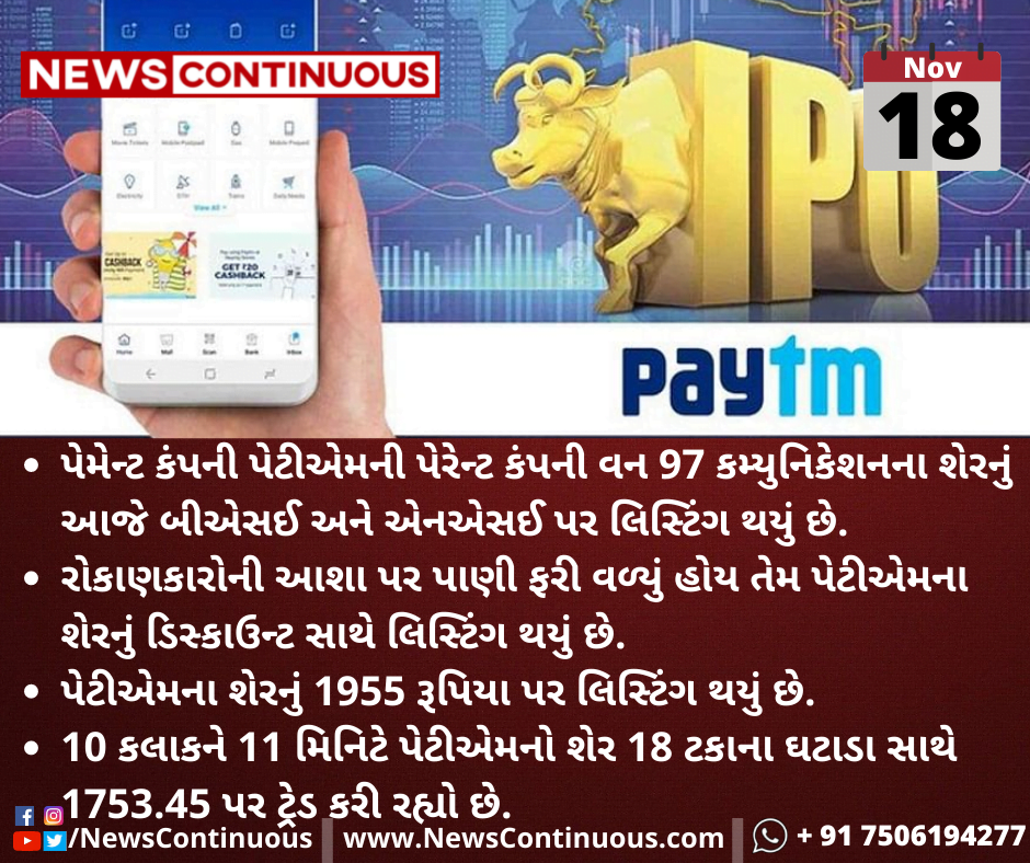 પેટીએમના શેરનું 1955 રૂપિયા પર લિસ્ટિંગ થયું છે.