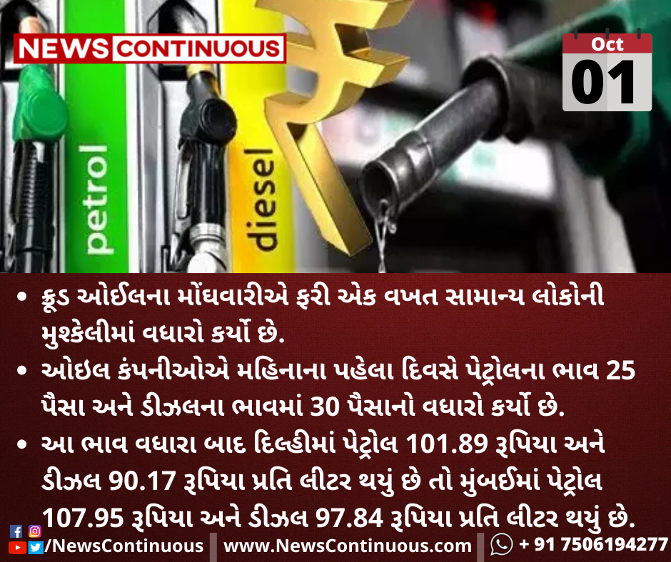આ ભાવ વધારા બાદ દિલ્હીમાં પેટ્રોલ 101.89 રૂપિયા અને ડીઝલ 90.17 રૂપિયા પ્રતિ લીટર થયું છે તો મુંબઈમાં પેટ્રોલ 107.95 રૂપિયા અને ડીઝલ 97.84 રૂપિયા પ્રતિ લીટર વેચાઈ રહ્યું છે.