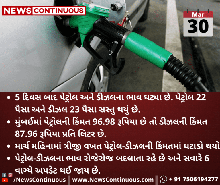 5 દિવસ બાદ પેટ્રોલ અને ડીઝલના ભાવ ઘટ્યા છે. પેટ્રોલ 22 પૈસા અને ડીઝલ 23 પૈસા સસ્તુ થયું છે.