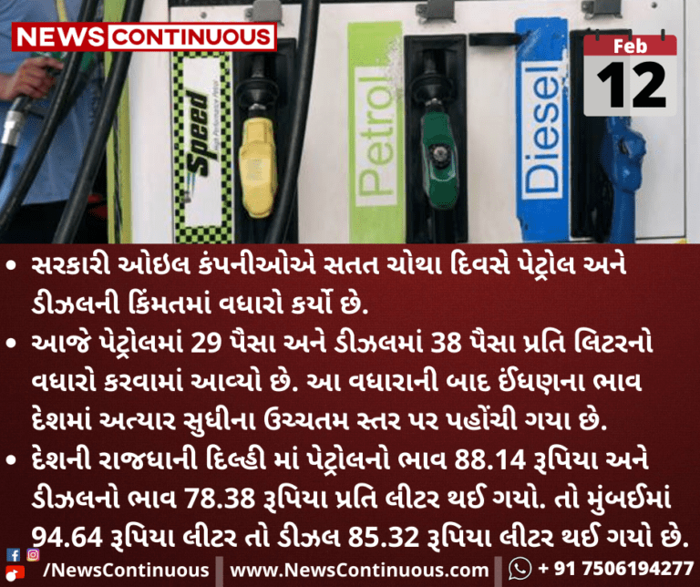 સરકારી ઓઇલ કંપનીઓએ સતત ચોથા દિવસે પેટ્રોલ અને ડીઝલની કિંમતમાં વધારો કર્યો છે.