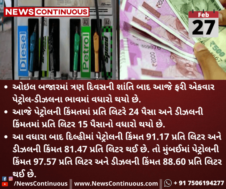 આ વધારા બાદ દિલ્હીમાં પેટ્રોલની કિંમત 91.17 પ્રતિ લિટર અને ડીઝલની કિંમત 81.47 પ્રતિ લિટર થઈ છે. તો મુંબઈમાં પેટ્રોલની કિંમત 97.57 પ્રતિ લિટર અને ડીઝલની કિંમત 88.60 પ્રતિ લિટર થઈ છે.