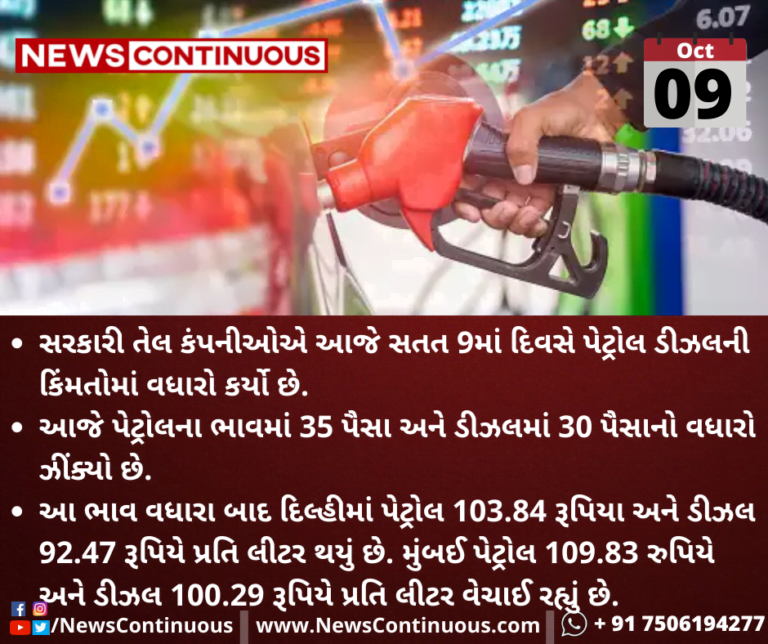સરકારી તેલ કંપનીઓએ આજે સતત 9માં દિવસે પેટ્રોલ ડીઝલની કિંમતોમાં વધારો કર્યો છે.