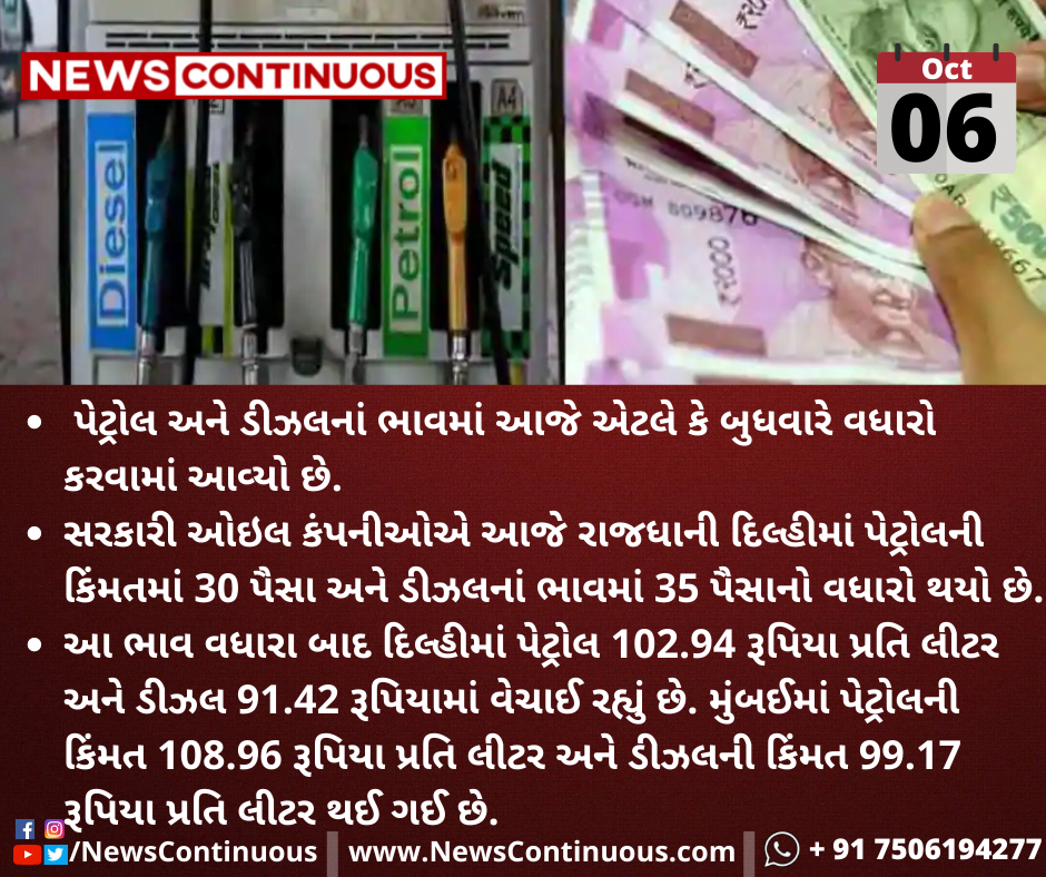 પેટ્રોલ અને ડીઝલનાં ભાવમાં આજે એટલે કે બુધવારે વધારો કરવામાં આવ્યો છે.