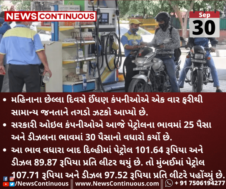 સરકારી ઓઇલ કંપનીઓએ આજે પેટ્રોલના ભાવમાં 25 પૈસા અને ડીઝલના ભાવમાં 30 પૈસાનો વધારો કર્યો છે.
