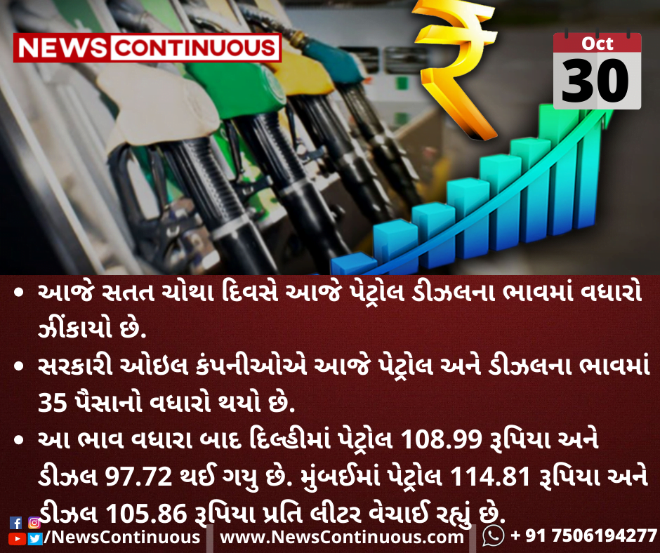 આજે સતત ચોથા દિવસે આજે પેટ્રોલ ડીઝલના ભાવમાં વધારો ઝીંકાયો છે.