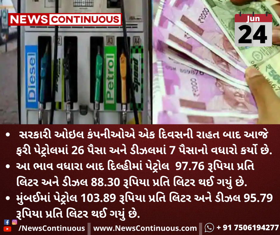 સરકારી ઓઇલ કંપનીઓએ એક દિવસની રાહત બાદ આજે ફરી પેટ્રોલમાં 26 પૈસા અને ડીઝલમાં 7 પૈસાનો વધારો કર્યો છે.