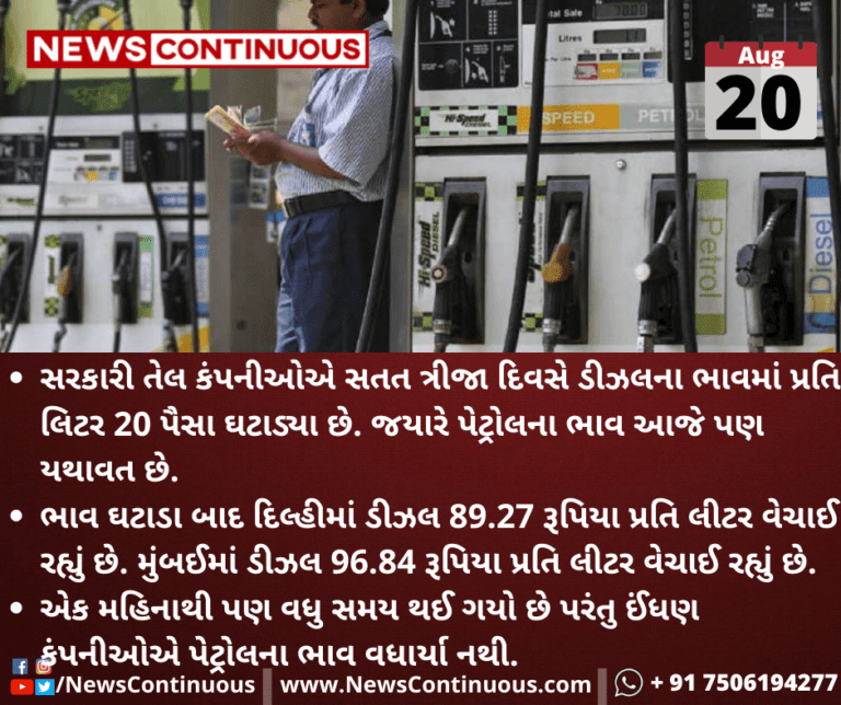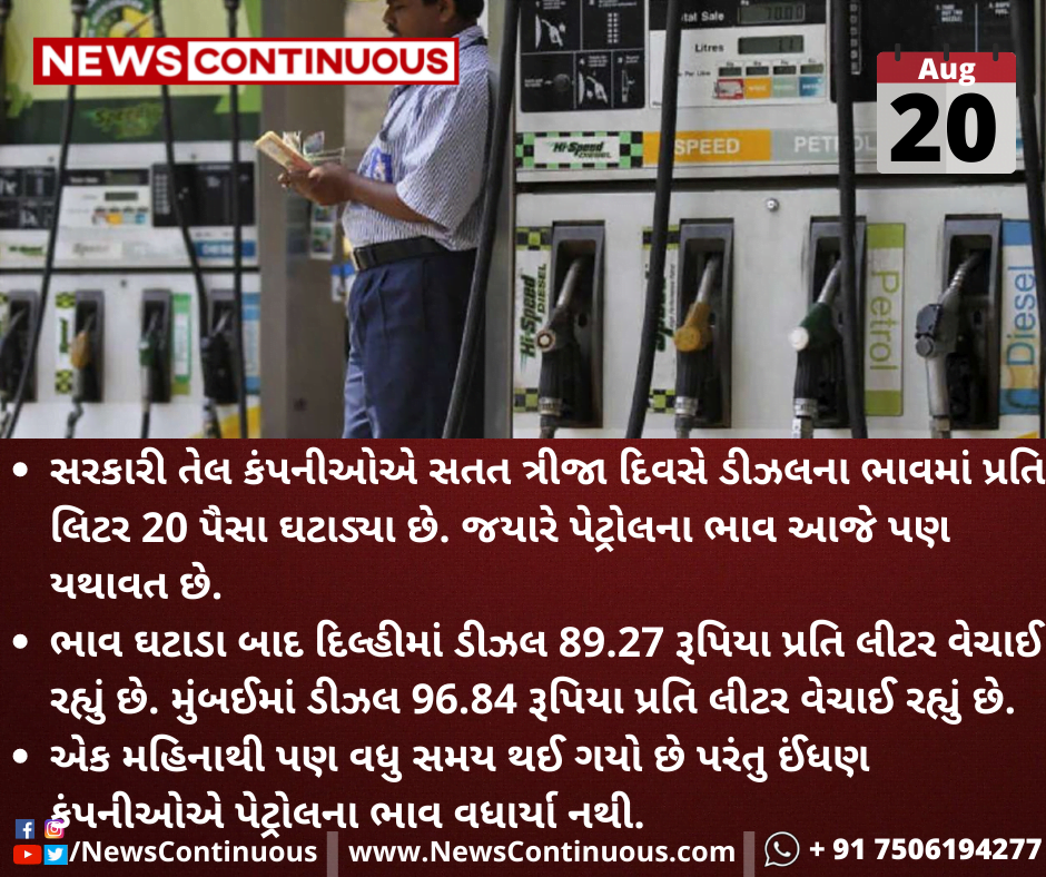સરકારી તેલ કંપનીઓએ સતત ત્રીજા દિવસે ડીઝલના ભાવમાં પ્રતિ લિટર 20 પૈસા ઘટાડ્યા છે. જયારે પેટ્રોલના ભાવ આજે પણ યથાવત છે.