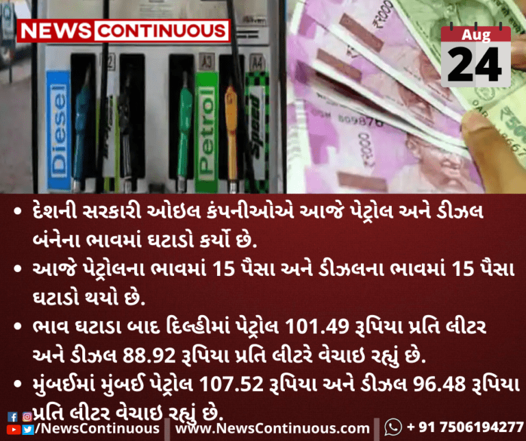 આજે પેટ્રોલના ભાવમાં 15 પૈસા અને ડીઝલના ભાવમાં 15 પૈસા ઘટાડો થયો છે.