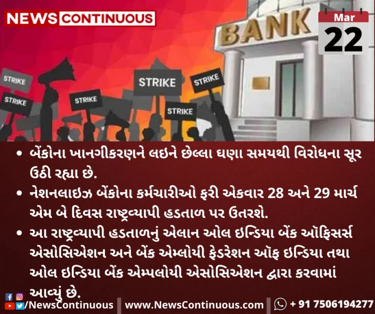 નેશનલાઇઝ બેંકોના કર્મચારીઓ ફરી એકવાર 28 અને 29 માર્ચ એમ બે દિવસ રાષ્ટ્રવ્યાપી હડતાળ પર ઉતરશે.