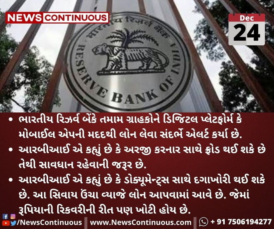 - ભારતીય રિઝર્વ બેંકે તમામ ગ્રાહકોને ડિજિટલ પ્લેટફોર્મ કે મોબાઈલ એપની મદદથી લોન લેવા સંદર્ભે એલર્ટ કર્યા છે.