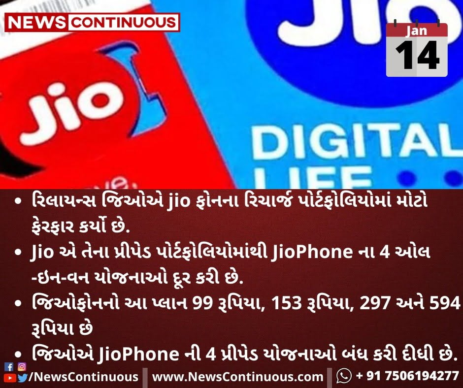 રિલાયન્સ jio એ જિયો ફોનમાં રિચાર્જ પોર્ટફોલિયોમાં મોટો ફેરફાર કર્યો છે.