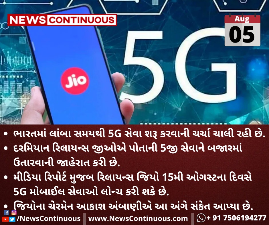 મીડિયા રિપોર્ટ મુજબ રિલાયન્સ જિયો 15મી ઓગસ્ટના દિવસે 5G મોબાઈલ સેવાઓ લોન્ચ કરી શકે છે.