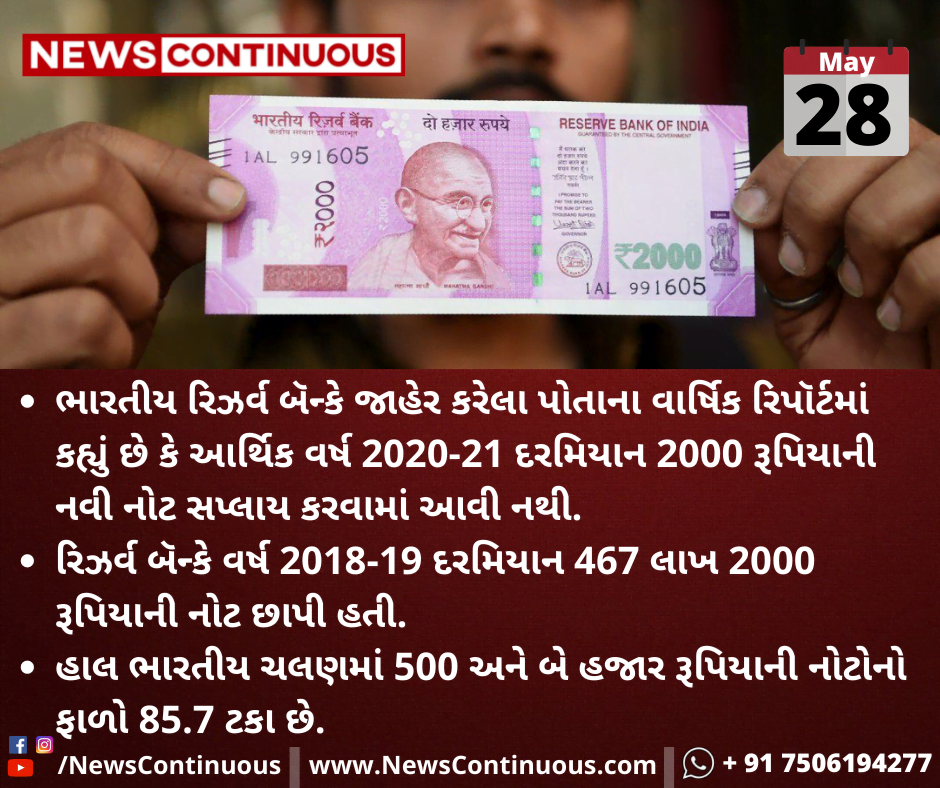 ભારતીય રિઝર્વ બૅન્કે જાહેર કરેલા પોતાના વાર્ષિક રિપૉર્ટમાં કહ્યું છે કે આર્થિક વર્ષ 2020-21 દરમિયાન 2000 રૂપિયાની નવી નોટ સપ્લાય કરવામાં આવી નથી.