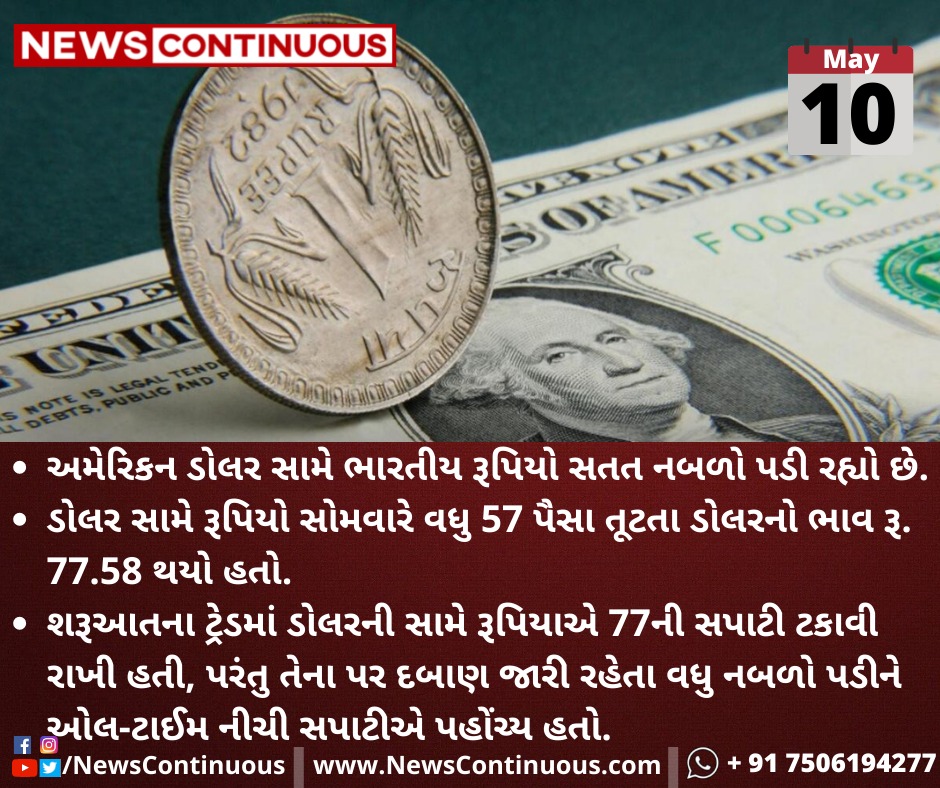 ભારતીય ચલણ(Indian currency)ની અગાઉની સૌથી નીચી સપાટી રૂ. 76.98 હતી જે 7 માર્ચે નોંધાઈ હતી. અત્યાર સુધીમાં ડોલરનો ભાવ 76.9580-77.5800ની બેન્ડમાં રહ્યો છે.