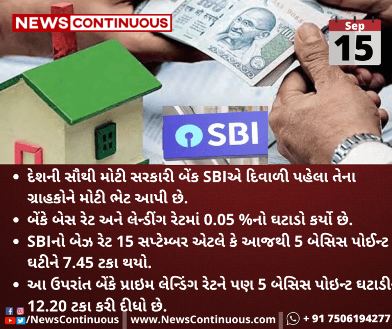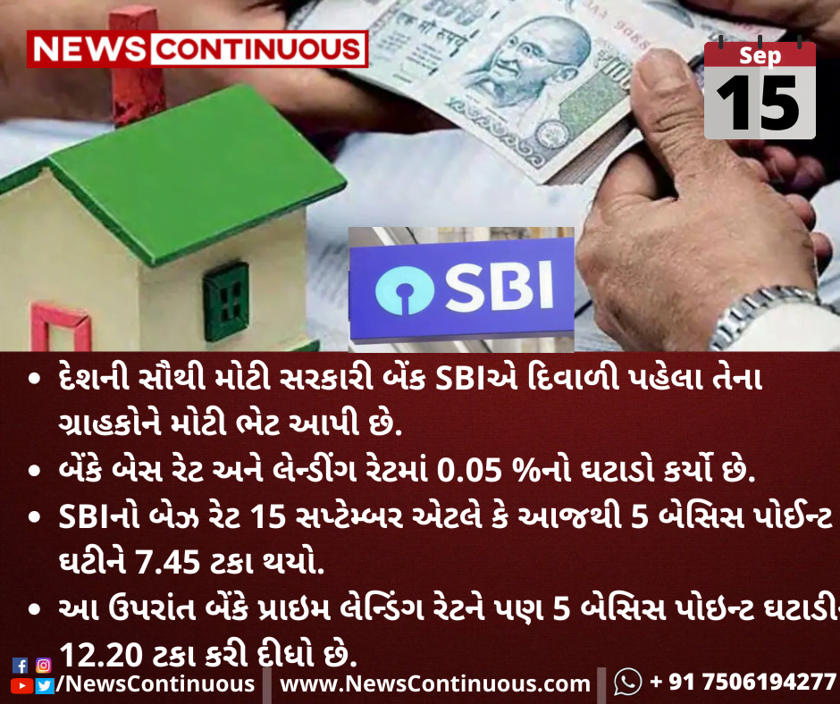 SBIનો બેઝ રેટ 15 સપ્ટેમ્બર એટલે કે આજથી 5 બેસિસ પોઈન્ટ ઘટીને 7.45 ટકા થયો.