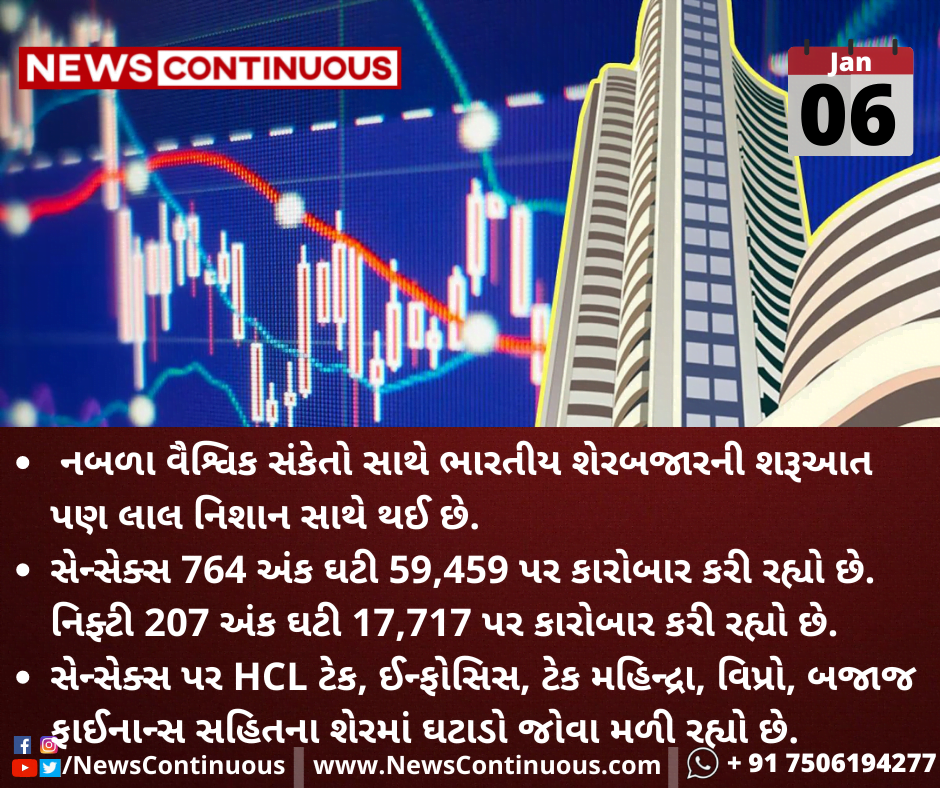 સેન્સેક્સ 764 અંક ઘટી 59,459 પર કારોબાર કરી રહ્યો છે. નિફ્ટી 207 અંક ઘટી 17,717 પર કારોબાર કરી રહ્યો છે