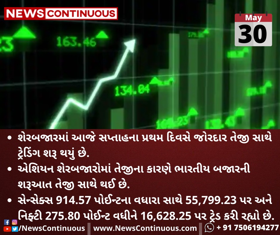 સેન્સેક્સ 914.57 પોઈન્ટના વધારા સાથે 55,799.23 પર અને નિફ્ટી 275.80 પોઈન્ટ વધીને 16,628.25 પર ટ્રેડ કરી રહ્યો છે.