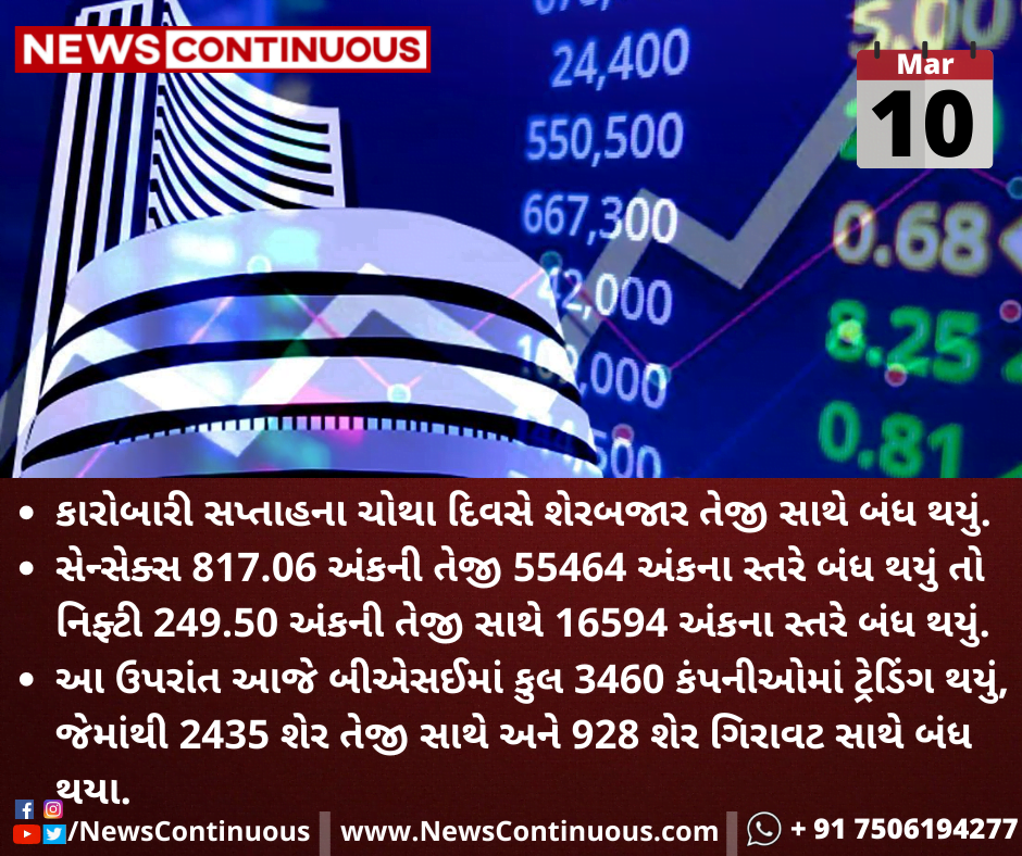 આજે સેન્સેક્સ 817.06 અંકની તેજી 55464.39 અંકના સ્તરે બંધ થયું તો નિફ્ટી 249.50 અંકની તેજી સાથે 16594.90 અંકના સ્તરે બંધ થયું.