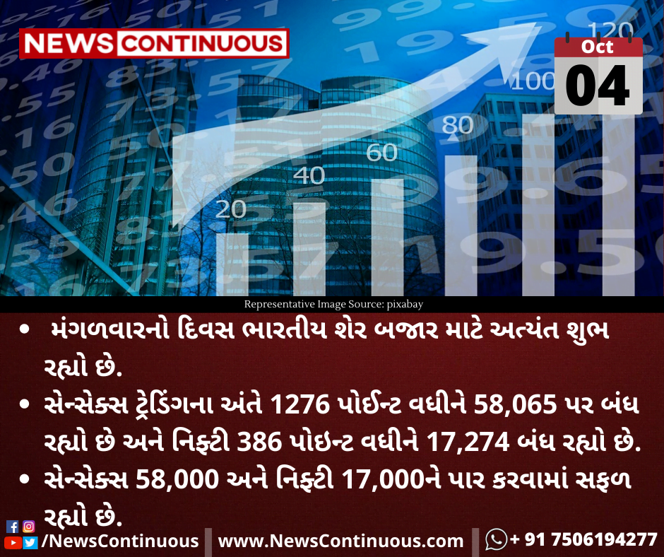 સેન્સેક્સ ટ્રેડિંગના અંતે 1276 પોઈન્ટ વધીને 58,065 પર બંધ રહ્યો છે અને નિફ્ટી 386 પોઇન્ટ વધીને 17,274 બંધ રહ્યો છે.