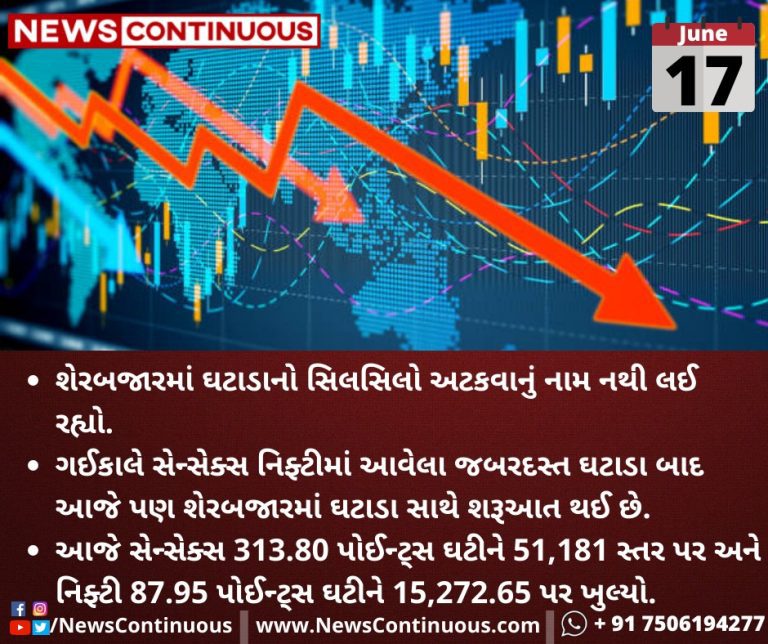 આજે સેન્સેક્સ 313.80 પોઈન્ટ્સ ઘટીને 51,181 સ્તર પર અને નિફ્ટી 87.95 પોઈન્ટ્સ ઘટીને 15,272.65 પર ખુલ્યો.