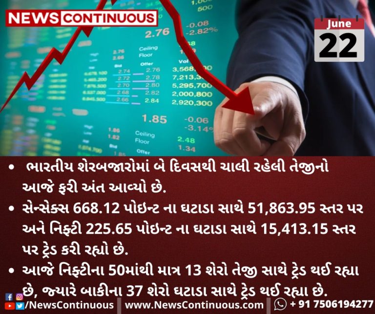 સેન્સેક્સ(sensex) 668.12 પોઇન્ટ ના ઘટાડા સાથે 51,863.95 સ્તર પર અને નિફ્ટી(Nifty) 225.65 પોઇન્ટ ના ઘટાડા સાથે 15,413.15 સ્તર પર ટ્રેડ કરી રહ્યો છે.