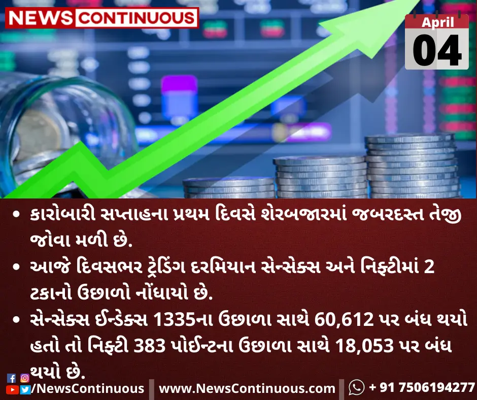 સેન્સેક્સ ઈન્ડેક્સ 1335ના ઉછાળા સાથે 60,612 પર બંધ થયો હતો તો નિફ્ટી 383 પોઈન્ટના ઉછાળા સાથે 18,053 પર બંધ થયો છે.