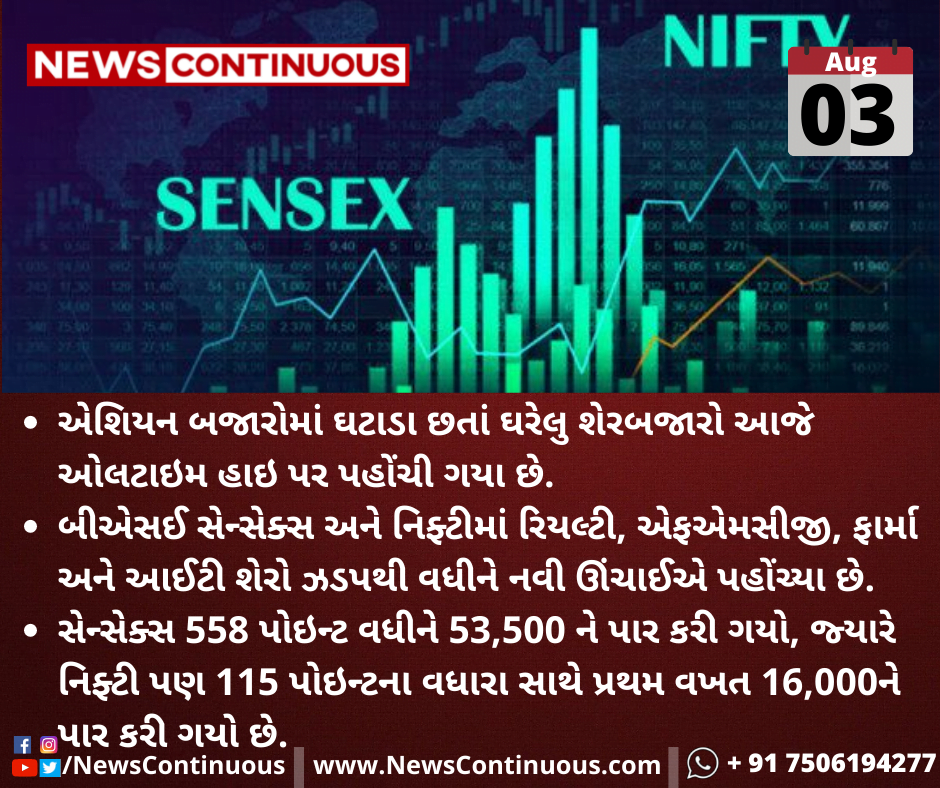 સેન્સેક્સ 558 પોઇન્ટ વધીને 53,500 ને પાર કરી ગયો, જ્યારે નિફ્ટી પણ 115 પોઇન્ટના વધારા સાથે પ્રથમ વખત 16,000 ને પાર કરી ગયો છે.