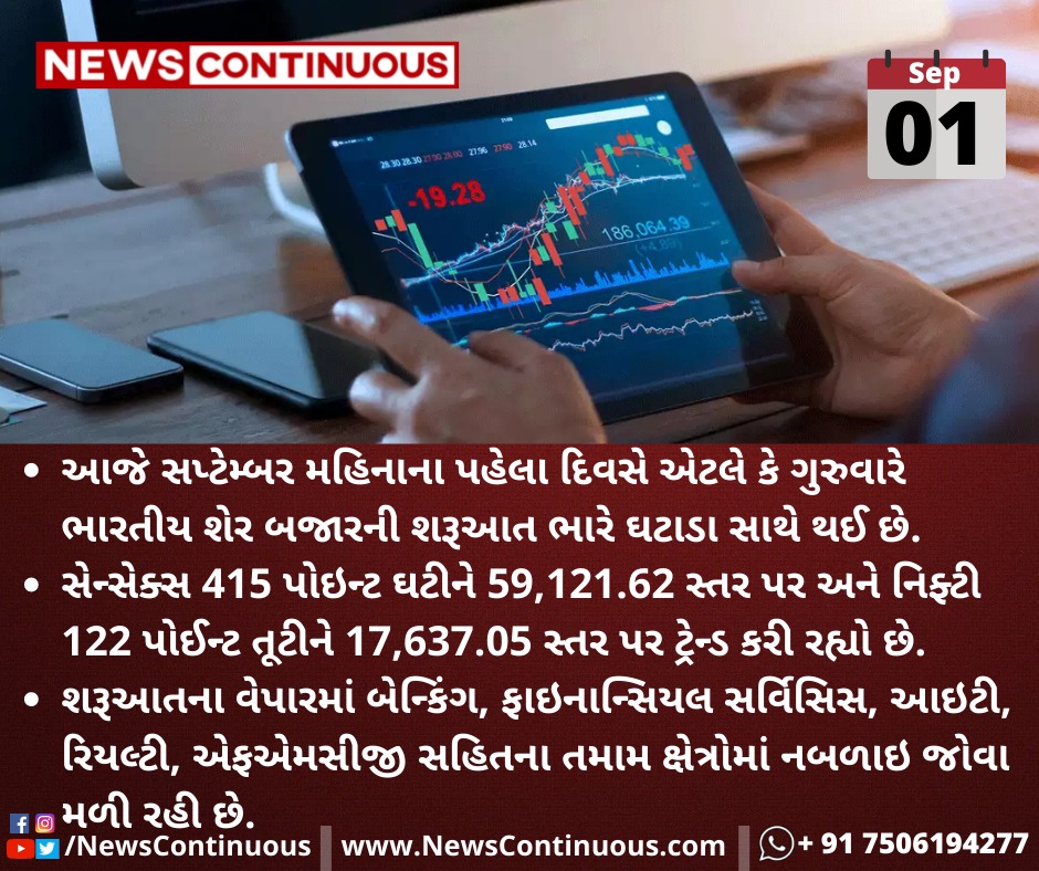 આજે સપ્ટેમ્બર મહિનાના પહેલા દિવસે એટલે કે ગુરુવારે ભારતીય શેર બજારની શરૂઆત ભારે ઘટાડા સાથે થઈ છે.