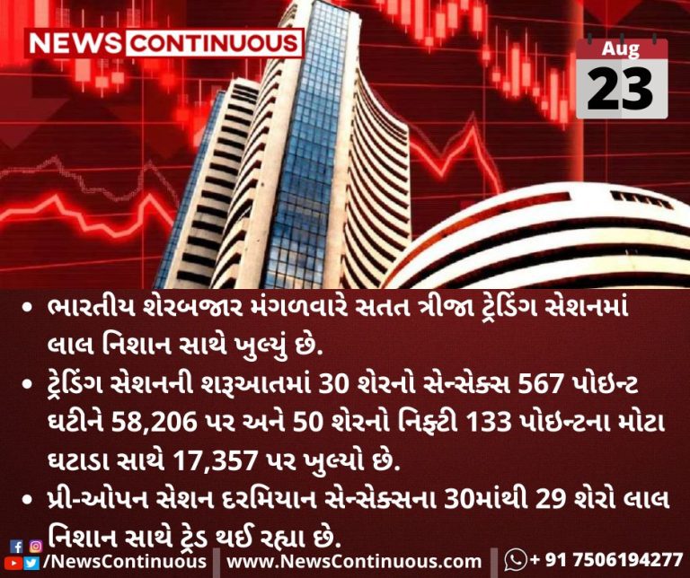 ભારતીય શેરબજાર મંગળવારે સતત ત્રીજા ટ્રેડિંગ સેશનમાં લાલ નિશાન સાથે ખુલ્યું છે.