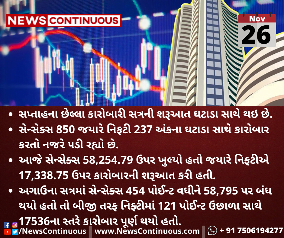 આજે સેન્સેક્સ 58,254.79 ઉપર ખુલ્યો હતો જયારે નિફટીએ 17,338.75 ઉપર કારોબારની શરૂઆત કરી હતી.