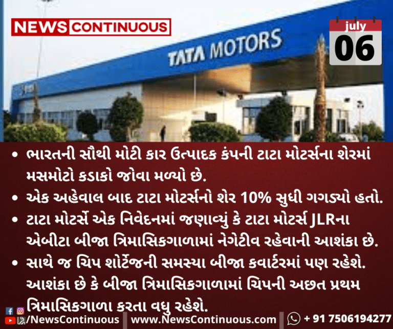 ઉલ્લેખનીય છે કે ગઈકાલના બંધ ભાવે ટાટા મોટર્સની માર્કેટ કેપિટલ 114899 કરોડ હતી,જે આજે ઘટીને 1.06.117 કરોડ થઈ છે.
