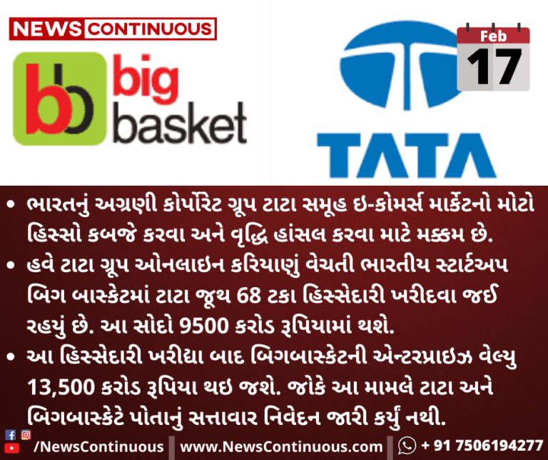 હવે ટાટા ગ્રૂપ ઓનલાઇન કરિયાણું વેચતી ભારતીય સ્ટાર્ટઅપ બિગબાસ્કેટમાં ટાટા જૂથ 68 ટકા હિસ્સેદારી ખરીદવા જઈ રહયું છે. આ સોદો 9000 કરોડ રૂપિયામાં થશે.