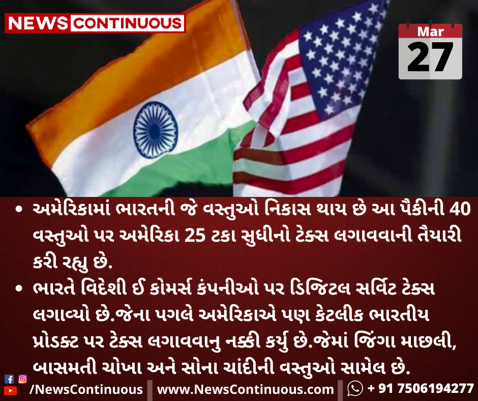 - અમેરિકામાં ભારતની જે વસ્તુઓ નિકાસ થાય છે આ પૈકીની 40 વસ્તુઓ પર અમેરિકા 25 ટકા સુધીનો ટેક્સ લગાવવાની તૈયારી કરી રહ્યુ છે.