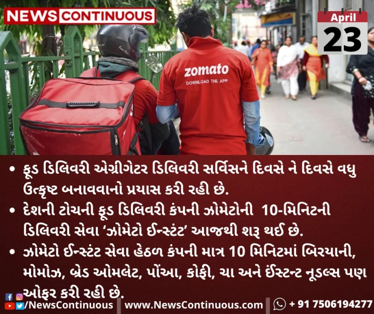દેશની ટોચની ફૂડ ડિલિવરી કંપની ઝોમેટોની(Zomato) 10-મિનિટની ડિલિવરી સેવા ‘ઝોમેટો ઈન્સ્ટંટ’(Zomato instant) આજથી શરૂ થઈ છે.