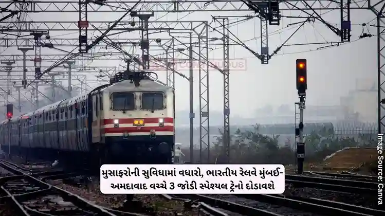 Western Railway: રેલ પ્રસાસન દ્વારા મુસાફરોની સુવિધા અને મુસાફરોની વધારાની ભીડ ને ધ્યાનમાં રાખીને અમદાવાદ અને મુંબઈ સેન્ટ્રલ, અમદાવાદ-લોકમાન્ય તિલક ટર્મિનસ (મુંબઈ) અને અમદાવાદ-દાદર (મધ્ય રેલ્વે) ની વચ્ચે ત્રણ જોડી સ્પેશ્યલ ટ્રેનો વિશેષ ભાડા પર ચલાવવાનો નિર્ણય લેવામાં આવ્યો છે. જેની વિગતો નીચે મુજબ છે: