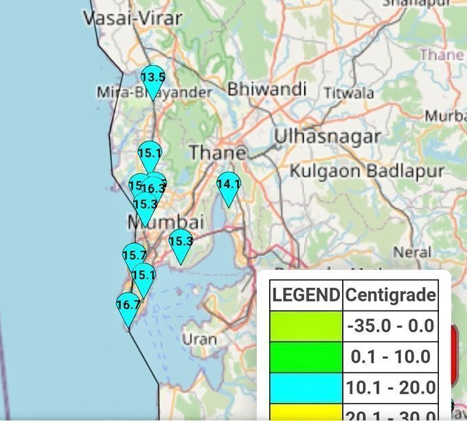 સવારે 8:00 વાગ્યે કોલાબા ખાતે તાપમાન 16 ડીગ્રી સેલ્સિયસ નોંધાયું હતું જ્યારે કે સાંતાક્રુઝમાં તાપમાન 13 ડિગ્રી સેલ્સિયસ હતું.