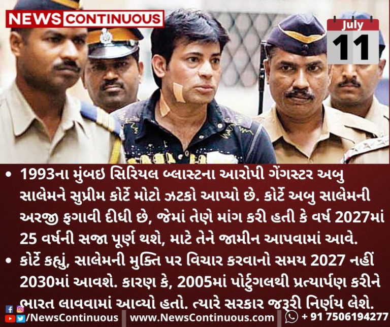 1993ના મુંબઇ સિરિયલ બ્લાસ્ટ(Mumbai serial blast)ના આરોપી ગેંગસ્ટર અબુ સાલેમ(Abu Salem)ને સુપ્રીમ કોર્ટે(Supreme court) મોટો ઝટકો આપ્યો છે.