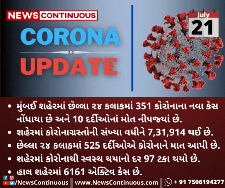 મુંબઈ શહેરમાં છેલ્લા ૨૪ કલાકમાં 351 કોરોનાના નવા કેસ નોંધાયા છે અને 10 દર્દીઓનાં મોત નીપજ્યાં છે.