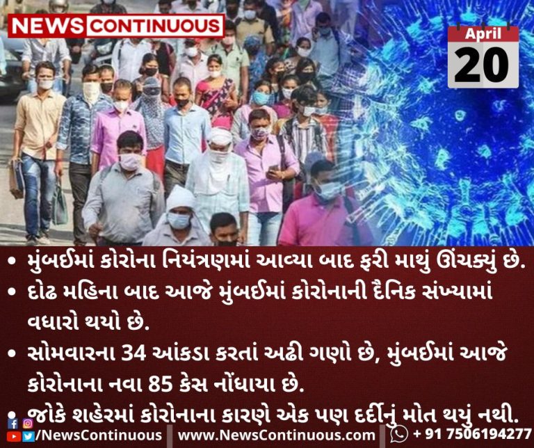 સોમવારના 34 આંકડા કરતાં અઢી ગણો છે, મુંબઈમાં આજે કોરોનાના નવા 85 કેસ નોંધાયા છે.