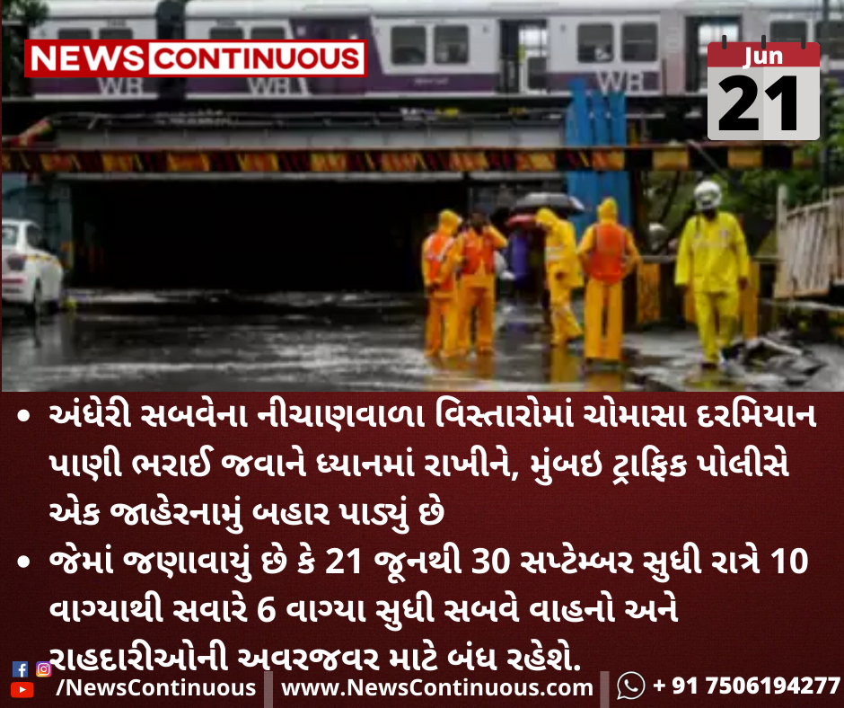 અંધેરી સબવેના નીચાણવાળા વિસ્તારોમાં ચોમાસા દરમિયાન પાણી ભરાઈ જવાને ધ્યાનમાં રાખીને, મુંબઇ ટ્રાફિક પોલીસે એક જાહેરનામું બહાર પાડ્યું છે