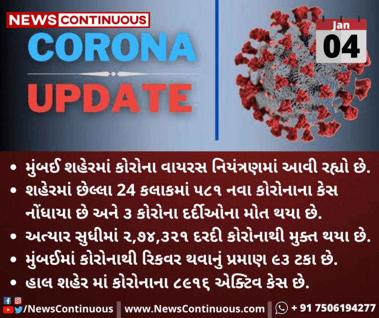 શહેરમાં છેલ્લા 24 કલાકમાં ૫૮૧ નવા કોરોનાના કેસ નોંધાયા છે અને ૩ કોરોના દર્દીઓના મોત થયા છે.