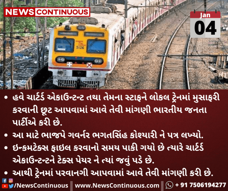 હવે ચાર્ટર્ડ એકાઉન્ટન્ટ તથા તેમના સ્ટાફને લોકલ ટ્રેનમાં મુસાફરી કરવાની છૂટ આપવામાં આવે તેવી માંગણી ભારતીય જનતા પાર્ટીએ કરી છે.