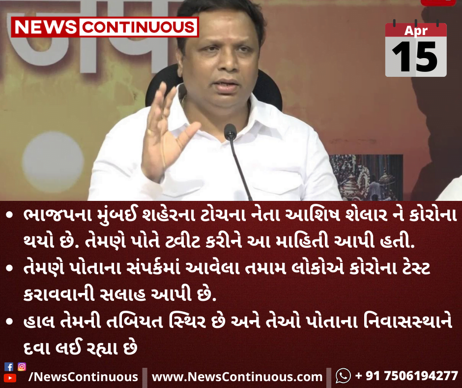 ભાજપના મુંબઈ શહેરના ટોચના નેતા આશિષ શેલાર ને કોરોના થયો છે. તેમણે પોતે ટ્વીટ કરીને આ માહિતી આપી હતી.