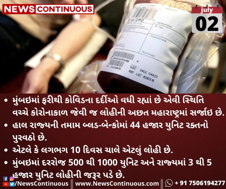 મુંબઇમાં ફરીથી કોવિડના દર્દીઓ(Covid patients) વધી રહ્યાં છે એવી સ્થિતિ વચ્ચે કોરોનાકાળ(Corona Period) જેવી જ લોહીની અછત(Blood shortage) મહારાષ્ટ્રમાં(Maharashtra) સર્જાઇ છે.