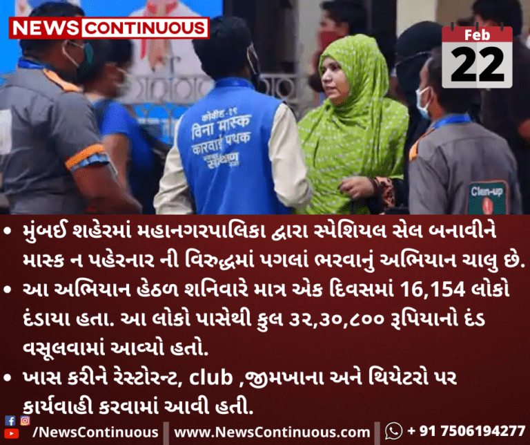 મુંબઈ શહેરમાં મહાનગરપાલિકા દ્વારા સ્પેશિયલ સેલ બનાવીને માસ્ક ન પહેરનાર ની વિરુદ્ધમાં પગલાં ભરવાનું અભિયાન ચાલુ છે.