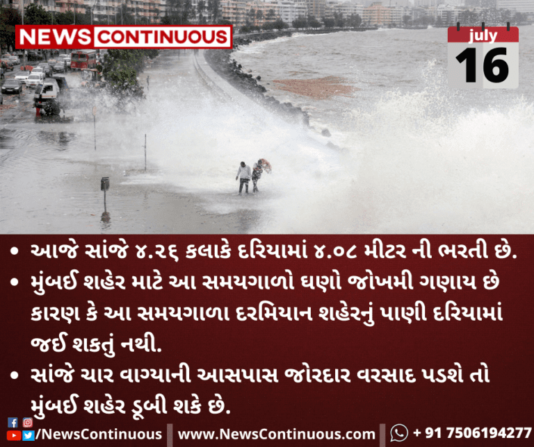 આજે સાંજે ૪.૨૬ કલાકે દરિયામાં ૪.૦૮ મીટર ની ભરતી છે.