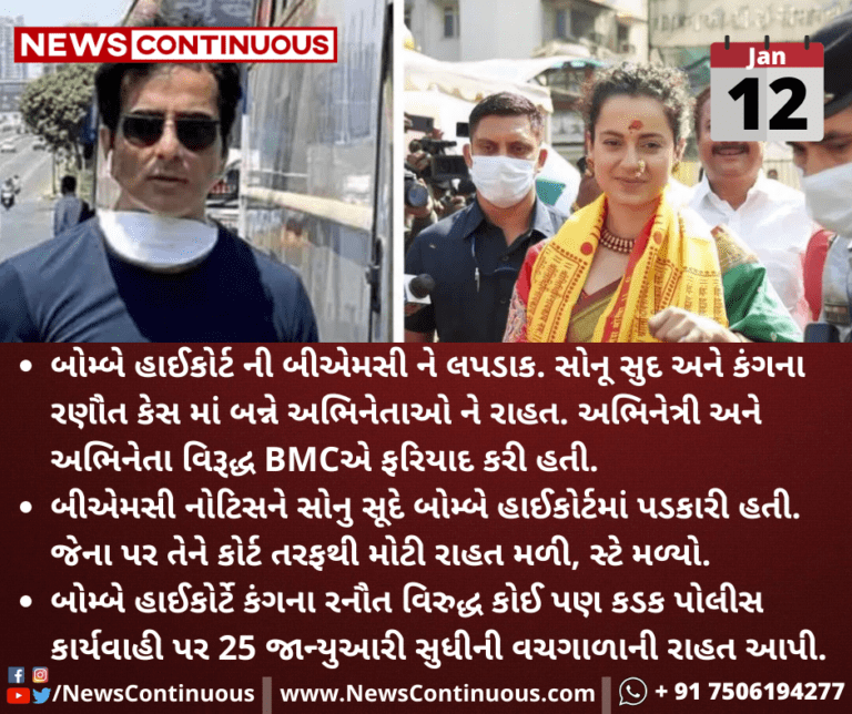 બોમ્બે હાઈકોર્ટ ની બીએમસી ને લપડાક. સોનૂ સુદ અને કંગના રણૌત કેસ માં બન્ને અભિનેતાઓ ને રાહત. અભિનેત્રી અને અભિનેતા વિરૂદ્ધ BMCએ ફરિયાદ કરી હતી.